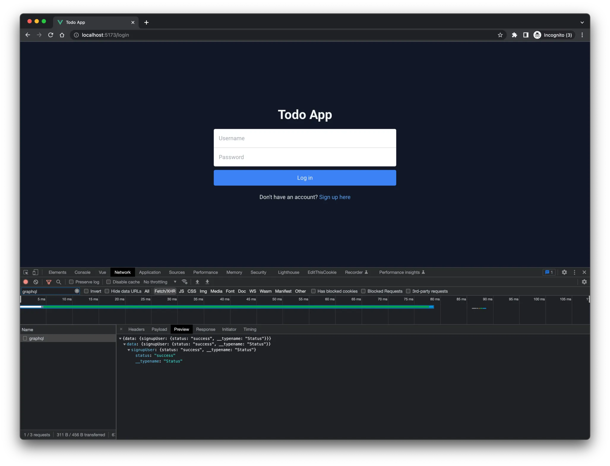 Right now we don’t display the todos, but you can test if this is working by checking the network tab in your browser to see if the mutation was sent successfully.